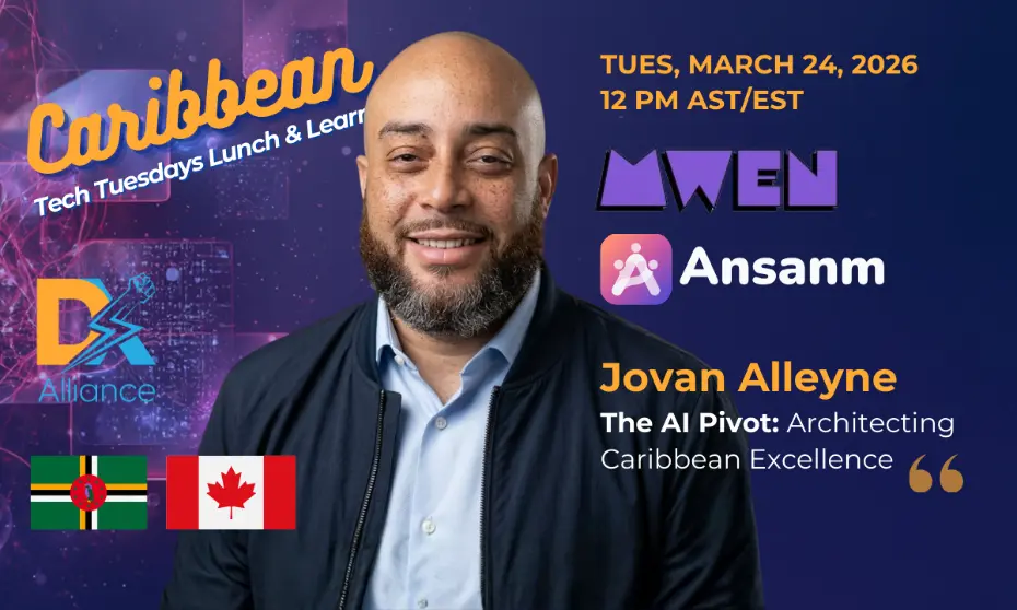 In this session of Tech Tuesdays, the DX Alliance presents a deep dive with Jovan Alleyne. Jovan will share his journey from leading engineering at high-growth start-ups to architecting sovereign regional solutions. This isn’t just a technical talk; it’s a blueprint for how our region’s talent can use the current phase of disruption to compete globally.